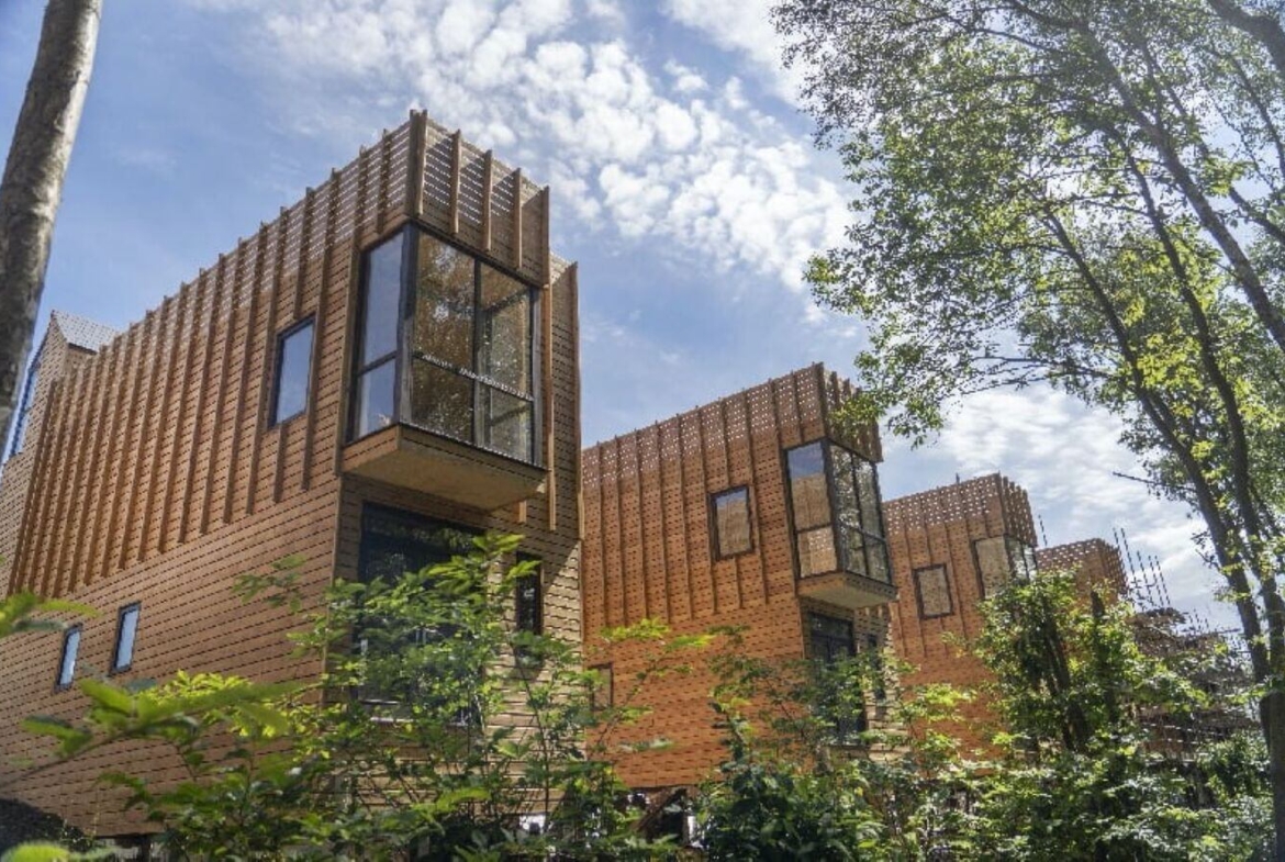 Located just off the A21 in 46 acres of natural woodland., it is built on stilts and accessed via a boardwalk. Each workspace has views over the woodland canopy fusing with nature as you ascend the walkway through the trees, above the sloping woodland floor below. Car parking is free and there are electric car charging points available.